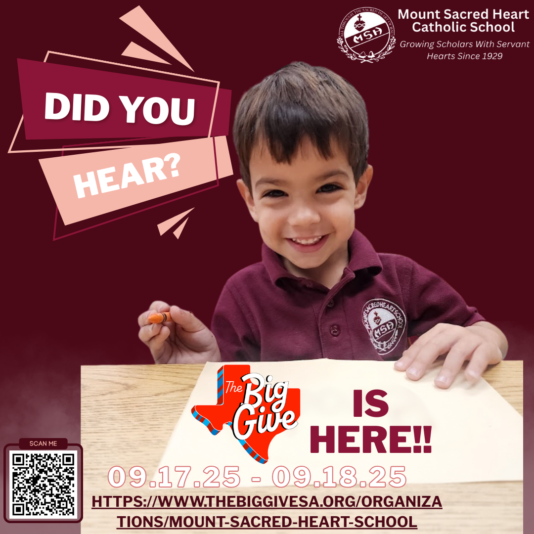 The Big Give kicks off September 17th! The Big Give is a 24-hour celebration of generosity across our region, and we are thrilled to take part. This is our moment to let San Antonio hear the heart of Mount Sacred Heart—our students, our families, and our mission of growing scholars with servant hearts. We need your voice today—share our story, invite others to join, and if you are able, make a gift to help close the tuition gap. Every act of generosity moves us closer to our goal. Thank you for standing with our Eagles, and may the Sacred Heart of Jesus bless you for the love you share.